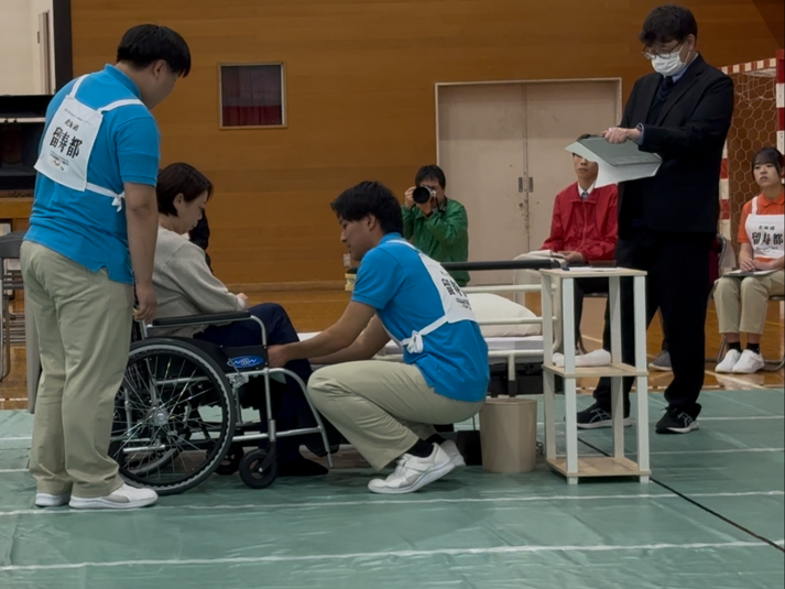 競技を行った生徒は、緊張している様子を見せつつも堂々と自分たちが考え練習した介助を行いました。留寿都高校は、異性介助という特徴を活かした安定感や安心感のある介護を提供していました。