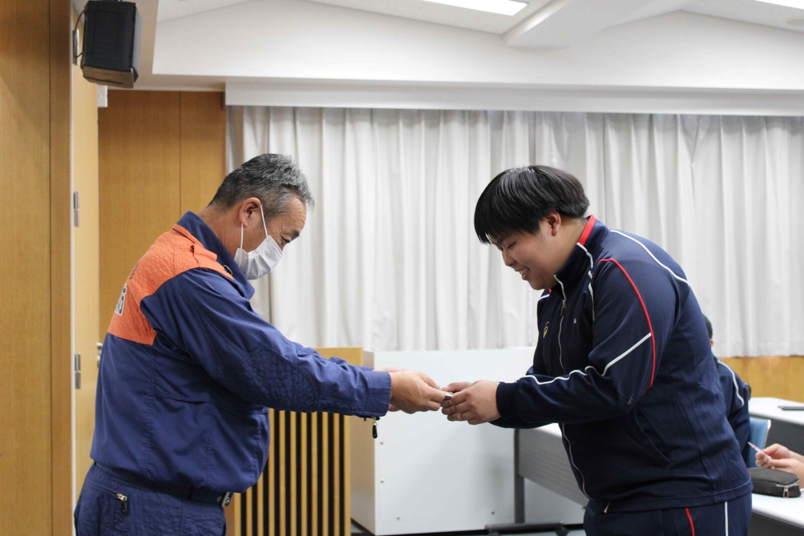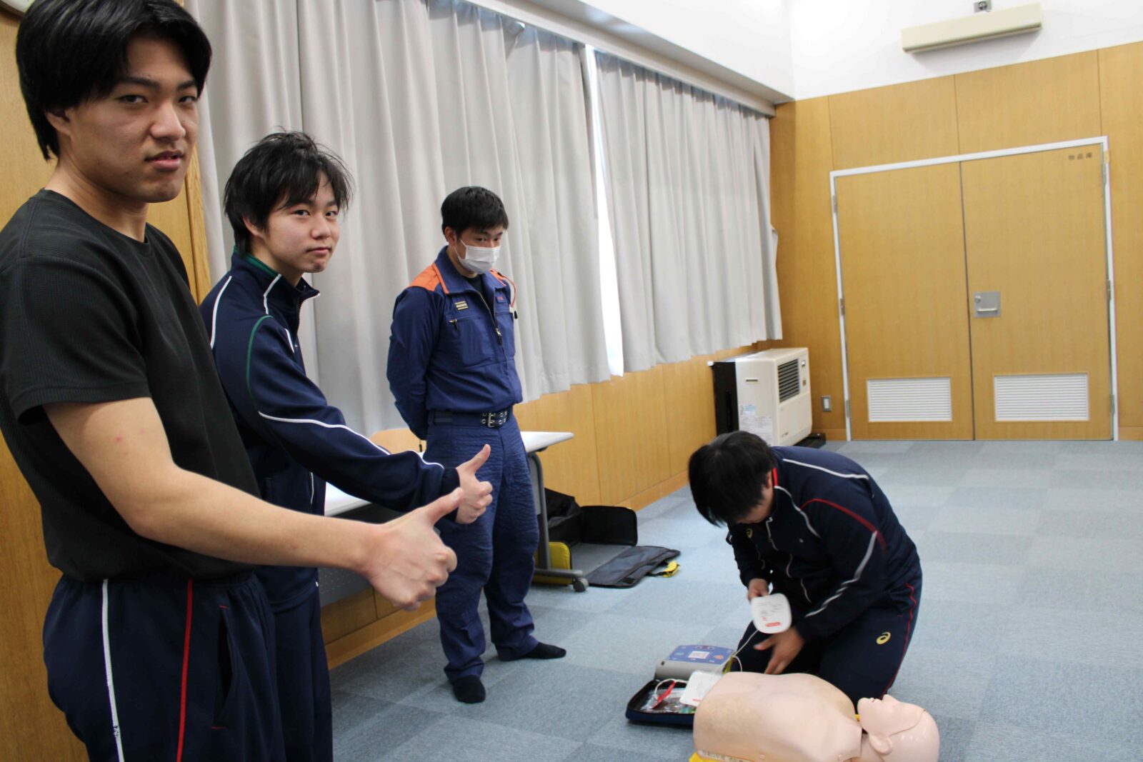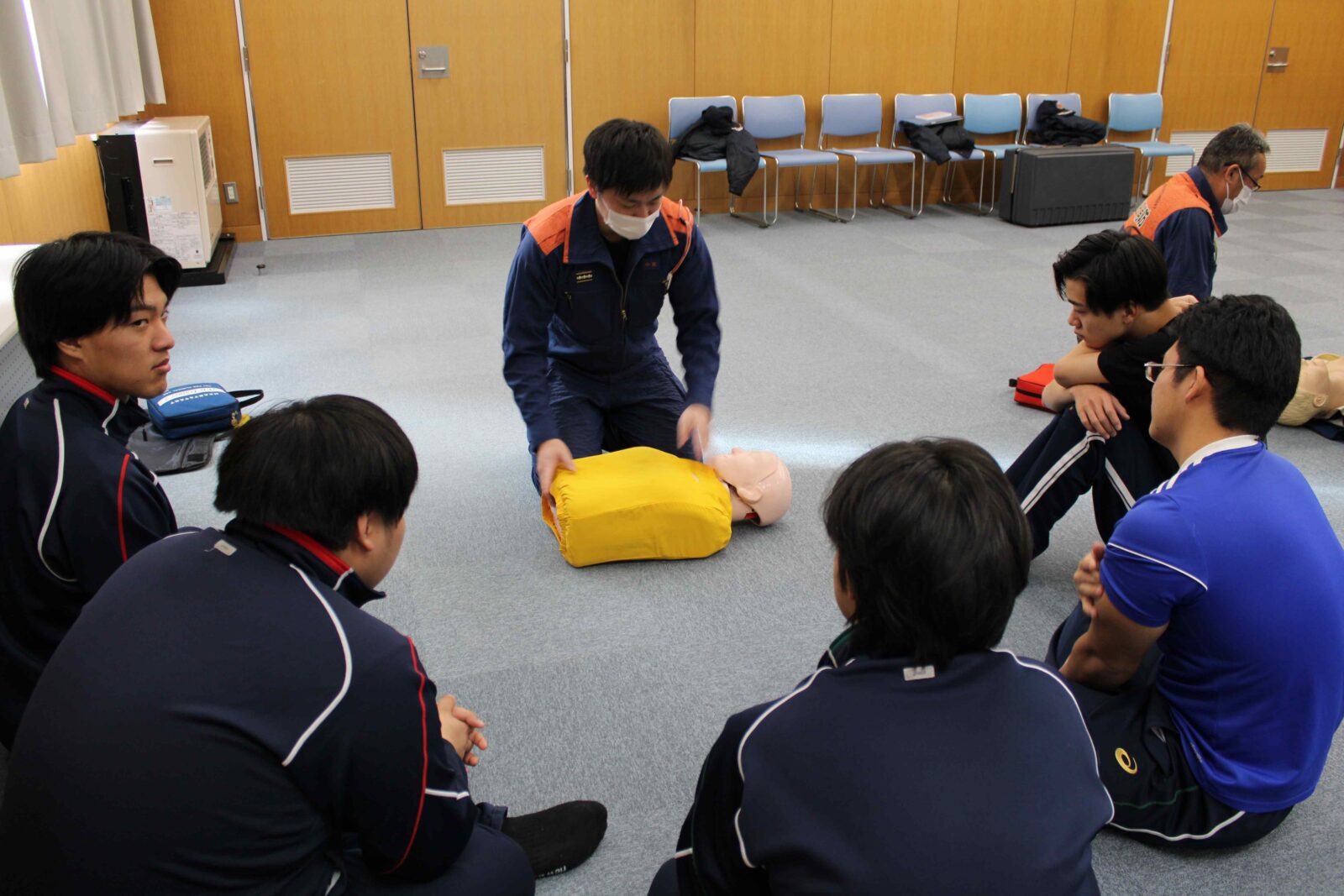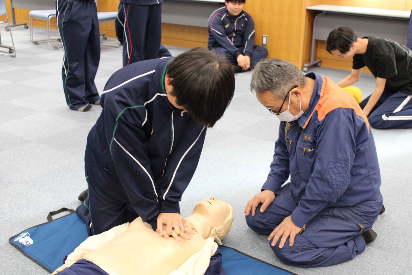 約3時間の講習では、救急救命に関する座学や実技を行い、心肺蘇生法やAEDの使い方など学びました。生徒たちは慣れない動きに戸惑いながらも、胸骨圧迫における力の加減などを一生懸命習得していました。講習の最後には、修了証が手渡され、生徒にとって貴重な学びの機会となりました。