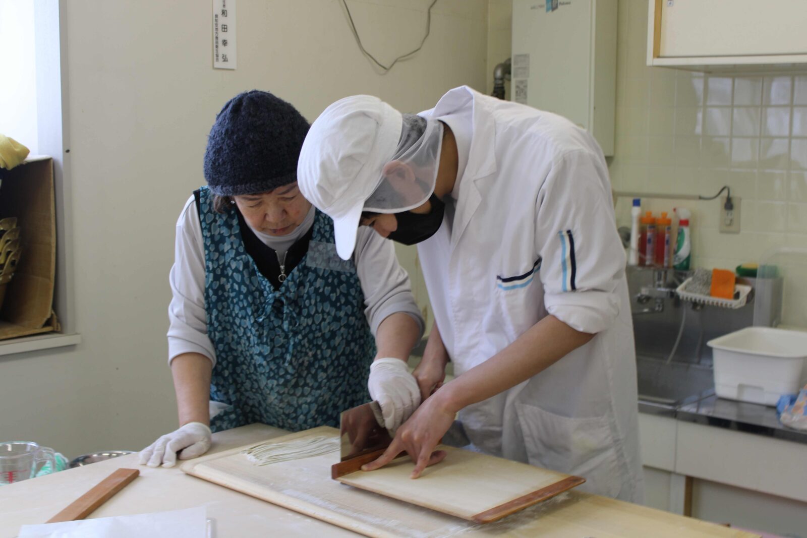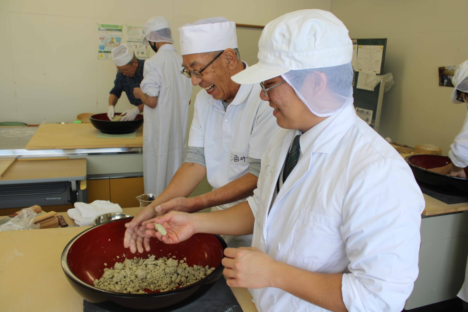 講師の先生方には水回し、地のし、四つだし、のし、たたみ、切りなどの工程を教わり、完成したそばはその場で茹で、試食をさせていただきました。