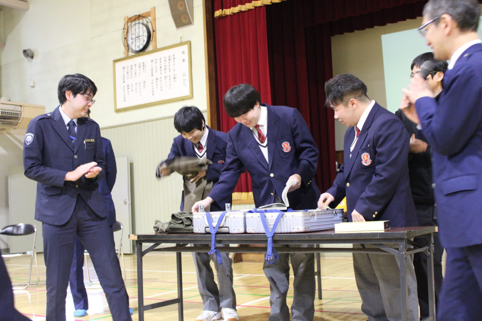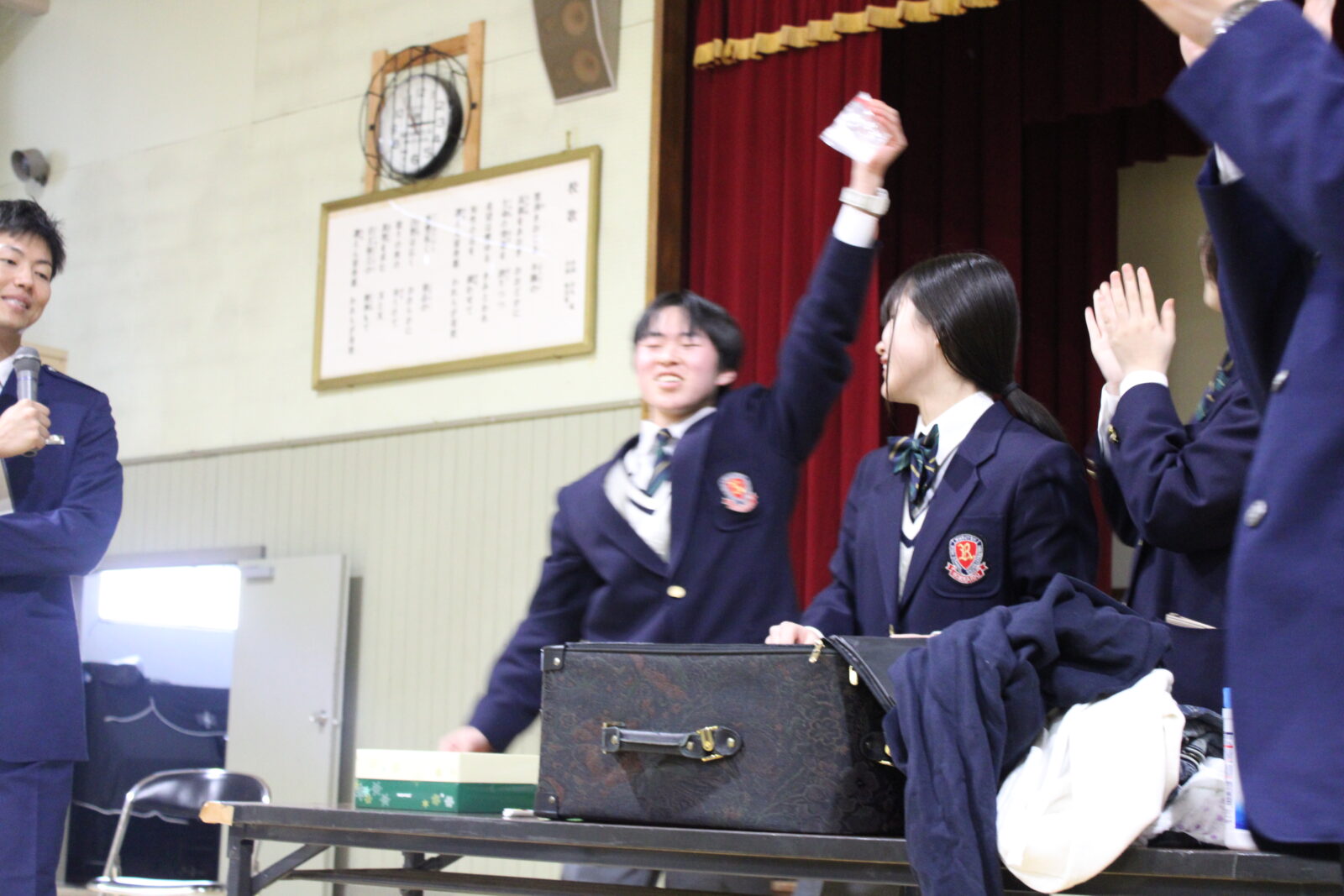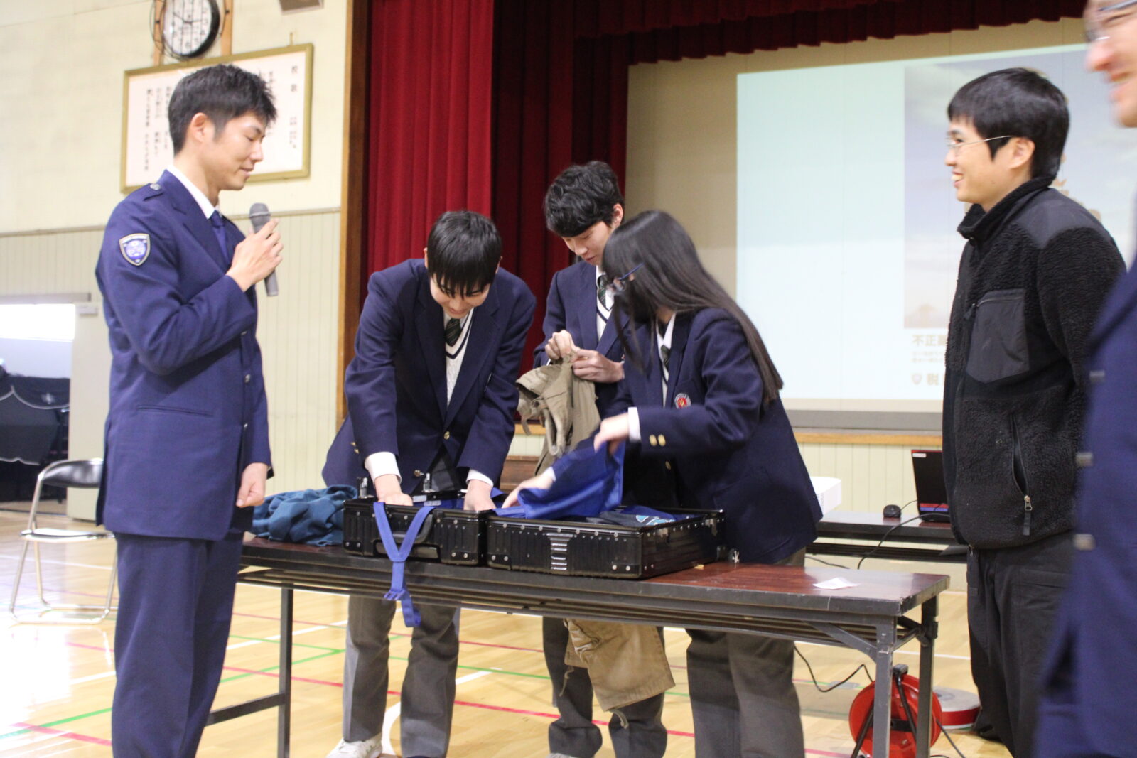 後半は、実際に生徒が関税職員役になり、旅行者の荷物に隠された薬物を探すチャレンジに各学年で挑戦しました!各学年から選出された3名は「どこだ?」「ないない!」と熱心に探していました。1年生の佐竹さんは無事に薬物を発見し、「全集中で見つけました!」と嬉しそうにコメントしていました。