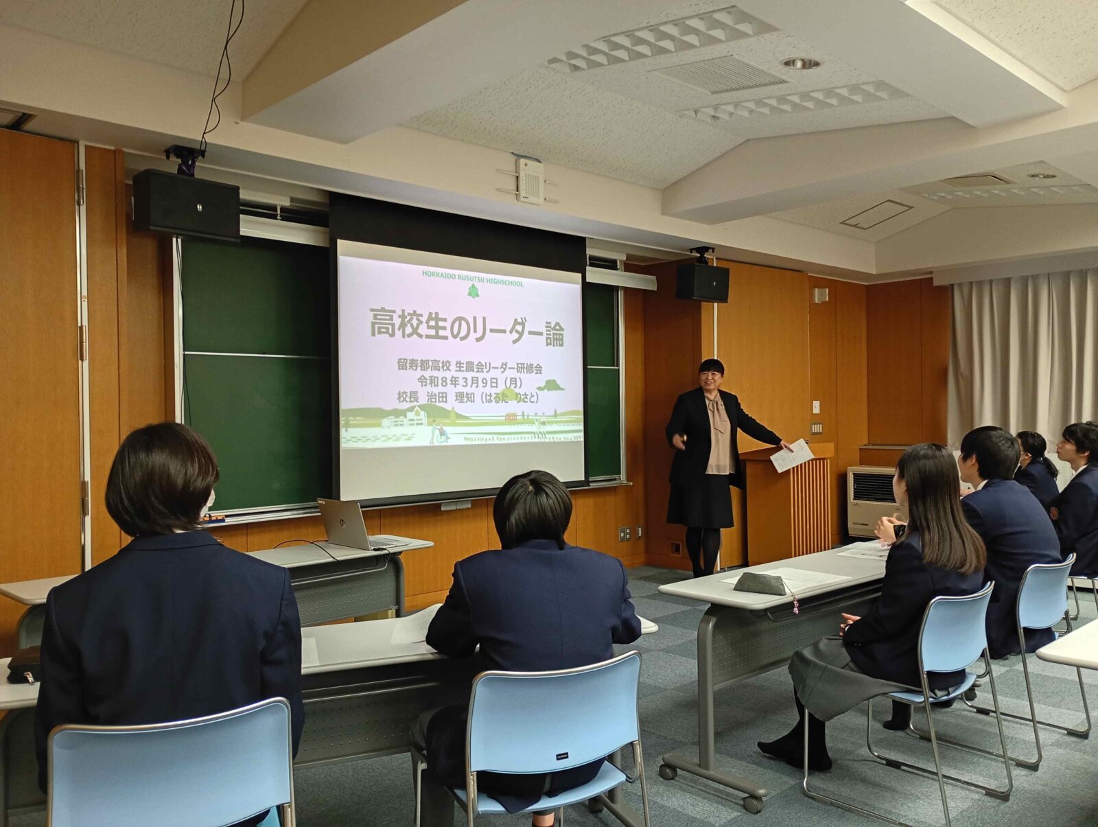 1日目は、校長先生による「高校生のリーダー論」の講話が行われました。全校生徒を牽引するリーダーとしての心構えや、執行部が意識すべき視点について、お話をいただきました。その後、前年度の活動反省会を行い、成果と課題を出し合うことで、次年度に向けた活動の土台を築きました。