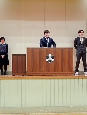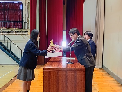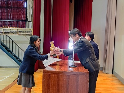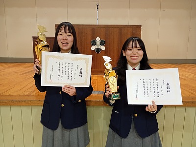 日本学校農業クラブ全国大会農業鑑定競技会分野(生活)に出場し「優秀賞」を受賞した3年生の髙瀬さんと、全国高校生介護技術コンテストに出場し「全国3位」及び「全国福祉高等学校長会理事長賞」を受賞した3年生の三舩さん(4年生の楠さん、佐々木さんは、卒業式に表彰を受けました)の二人は、留寿都村教育委員会 佐々木 利明 教育長から労いのお言葉をいただき、二人は堂々とした立派な態度で表彰を受けました。「一生懸命頑張った結果が、こうして表彰されてとても嬉しく思う」と、声をそろえて笑顔あふれる表情で話しをしてくれました。本当におめでとうございます!