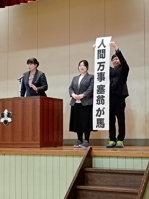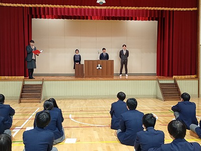 続けて、終業式と離任式を行いました。終業式では、校長先生から「人間万事塞翁が馬」の物語とそこから考えること、日頃の心のもちようについてなど、お話しがありました。
