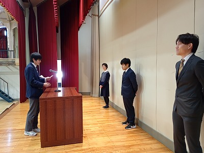 離任式では、今年度異動する先生は3名の紹介と、それぞれお一人ずつお別れの挨拶がありました。生徒会・農業クラブ会長の服部さんから、3人への感謝と想いを伝えました。