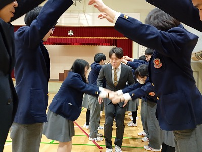 3人が退場する際は、生徒全員でアーチをつくりお見送りしました。新天地でもどうぞ元気でがんばってくださいね!