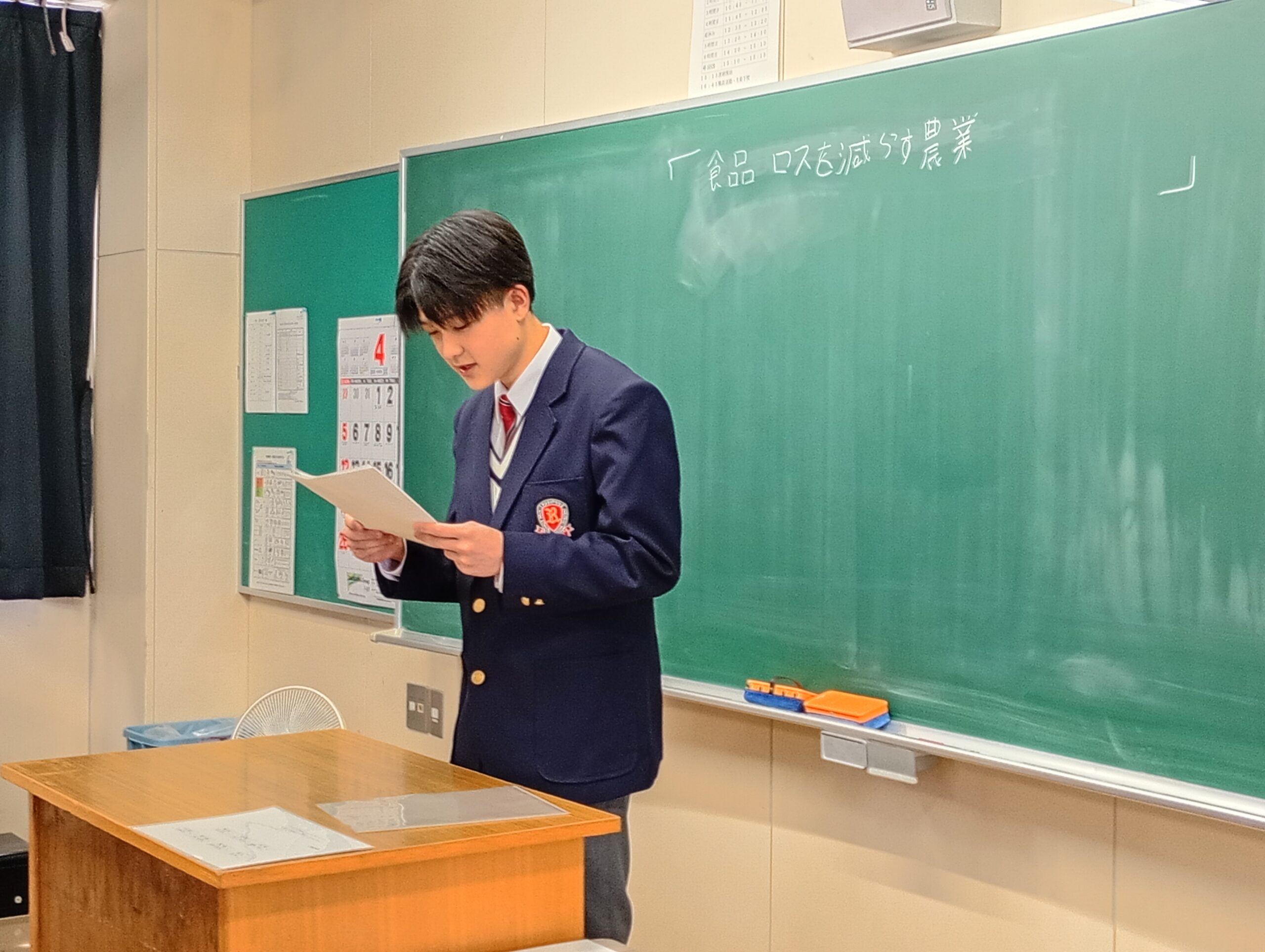 本日、1年生のクラス内意見発表会を実施しました。意見発表会とは、農業に関する身近な問題や将来の課題について、自分の抱負や意見をまとめ、皆の前で発表する行事です。今回の発表では、有機農業の未来と可能性、農業残渣(ざんさ)の環境に配慮した処理方法、農生産物の加工から流通、消費までのプロセスについて等、多彩なテーマが挙げられました。